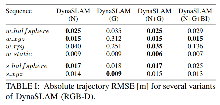 我们使用绝对轨迹RMSE作为实验的误差度量标准,这是由Sturm等人提出的[22].在这个数据集中,我们的系统的不同变体在六个序列上的结果如表I所示.首先,DynaSLAM(N)是只使用Mask R-CNN对先验动态对象进行分割的系统.其次,在DynaSLAM(G)中,动态对象仅通过基于深度变化的多视几何方法进行检测.第三,在DynaSLAM(N+G)中,动态物体的检测是通过结合几何和深度学习方法进行的.最后,我们认为分析图6所示的系统是有趣的.在这种情况下(N+G+BI),在跟踪和建图之前进行了背景修复(BI)阶段.这个实验的动机是,如果动态区域用静态内容进行修复,系统可以使用修复后的图像作为SLAM系统,在静止假设下运行.在这个提议中,ORB特征提取算法在帧的实际和重建区域中都能工作,并在先前处理过的关键帧的关键点上找到匹配点.