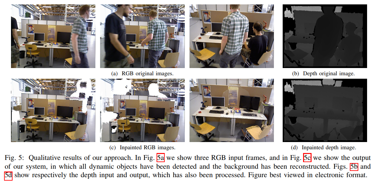 这些合成帧的第二个主要应用是:通过将运动区域修复为固定素材后,在基于静态假设的情况下使用修复后的图像进行SLAM运算。