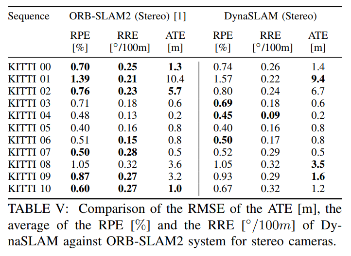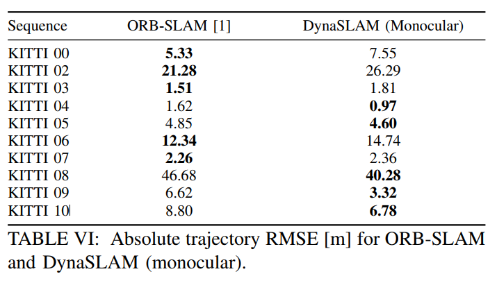 表VI详细列出了相同序列中ORB-SLAM与DynaSLAM单目变体的表现对比。值得指出的是,在单目与立体两种情况下所得结果具有相似性特征,并且前者对动态物体(如同DynaSLAM中所包含的额外元素)表现出更强的敏感度。观察某些特定序列时会发现,在未使用先验动态物体(如车辆、自行车等)作为跟踪特征的情况下可获得更好的准确度提升效果。例如,在KITTI 01与KITTI 04两个序列中均出现了大量移动车辆实例;而在多数被拍摄并停泊、静止的车辆与交通工具所在的序列中由于关键点间的距离较远且通常位于低纹理区域(如KITTI 00、KITTI 02、KITTI 06),因此所获得的绝对轨迹RMSE值通常较大程度上有所提升空间。然而,在采用循环闭合及重定位算法处理后所得的地图数据仅包含结构性物体特征(即地图数据具备可复用性并能在长期应用过程中持续发挥作用)。