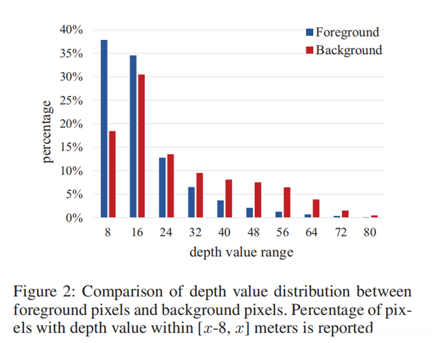 很少有作品(Jiaoetal.2018)对深度分布进行了分析,更不用说前景和背景的深度分布了。本文研究了训练子集中前景像素和背景像素的两种数据分布。图2显示了深度值的分布。如图所示,超过75%的前景像素的深度小于16m,