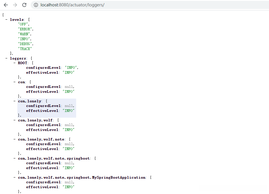 访问该链接http://localhost:8080/actuator/loggers有助于了解当前应用的运行状态及其详细信息。