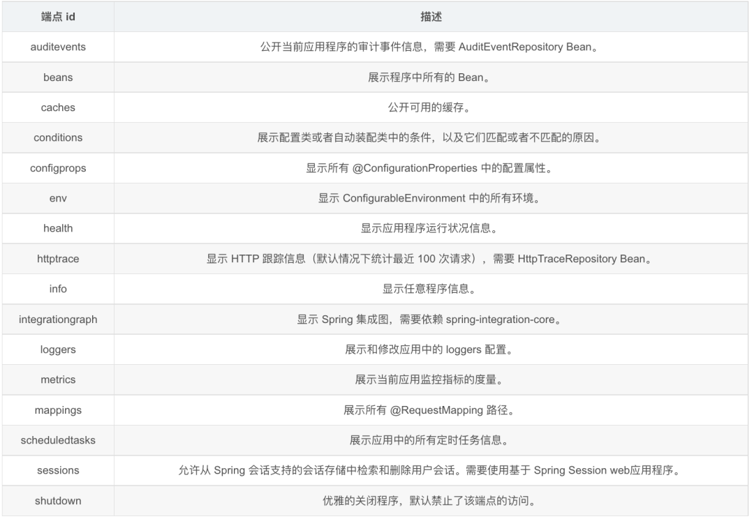每个端点都分配了一个独特的标识符,在访问时可以通过以下路径获取该标识符信息:http://{}:{}:{}{}/(SpringBoot 1.x)。