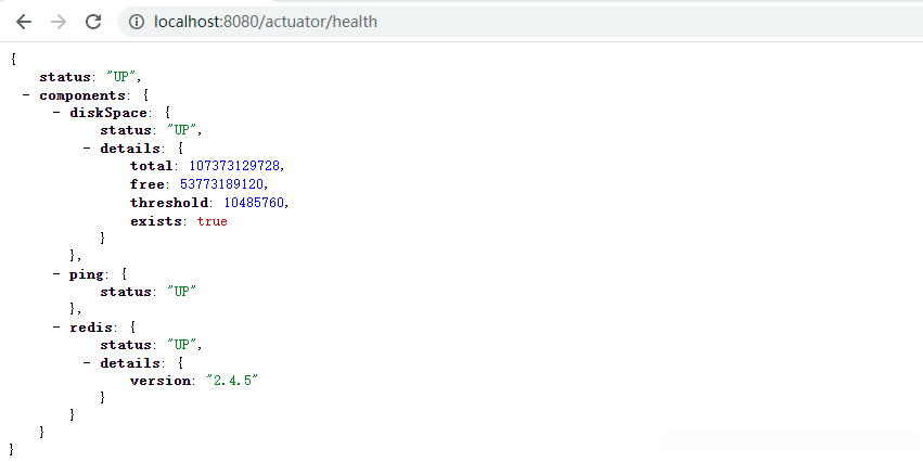 无需配置即可访问路径 http://localhost:8080/actuator/health;访问后将返回以下结果。