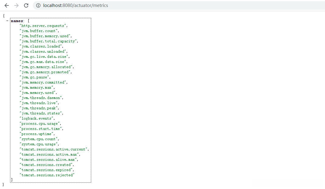 metrics 是一个关键的监控端点,它所包含的内容涵盖了 JVM 内存、堆、类加载、处理器和 tomcat 容器等多个重要指标。