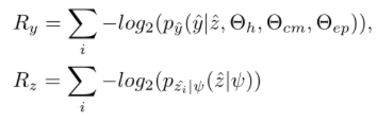 最后码率估计将由两部分组成:一部分是对主干自编码网络中压缩特征的估计码率,一部分是超参自编码网络压缩特征的估计码率:
