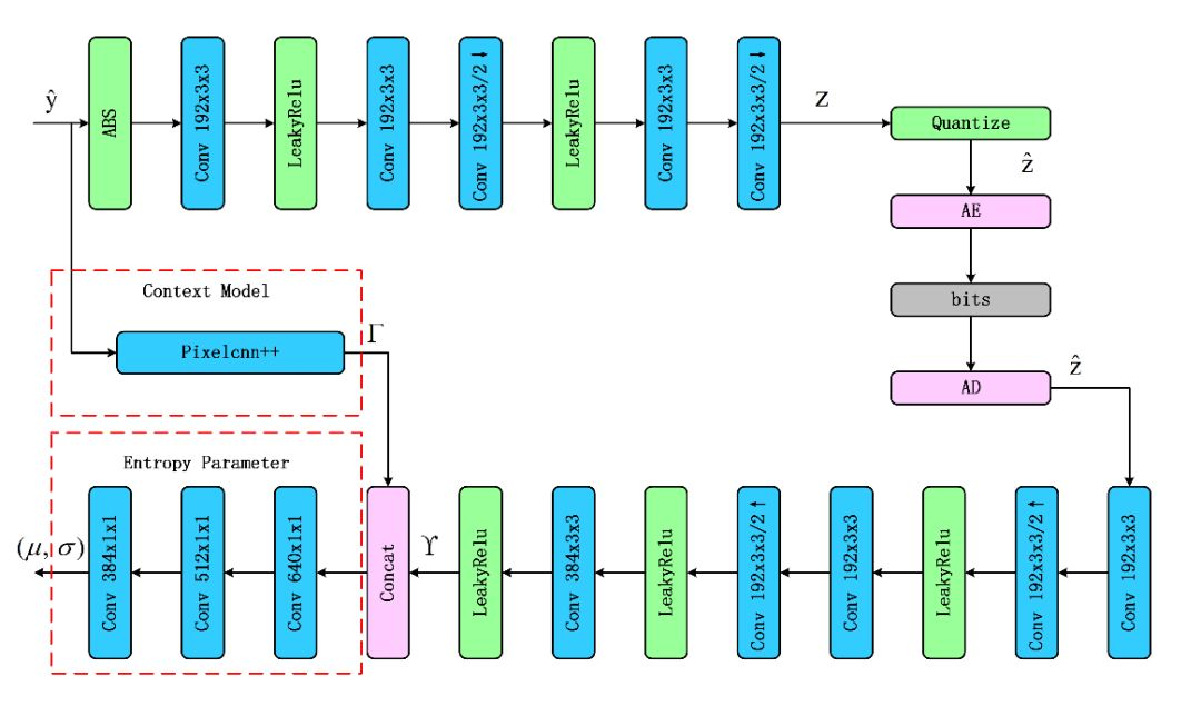 图2. 码率估计模块示意图,该模块包括超参自编码网络、上下文网络和熵参数网络三部分。
