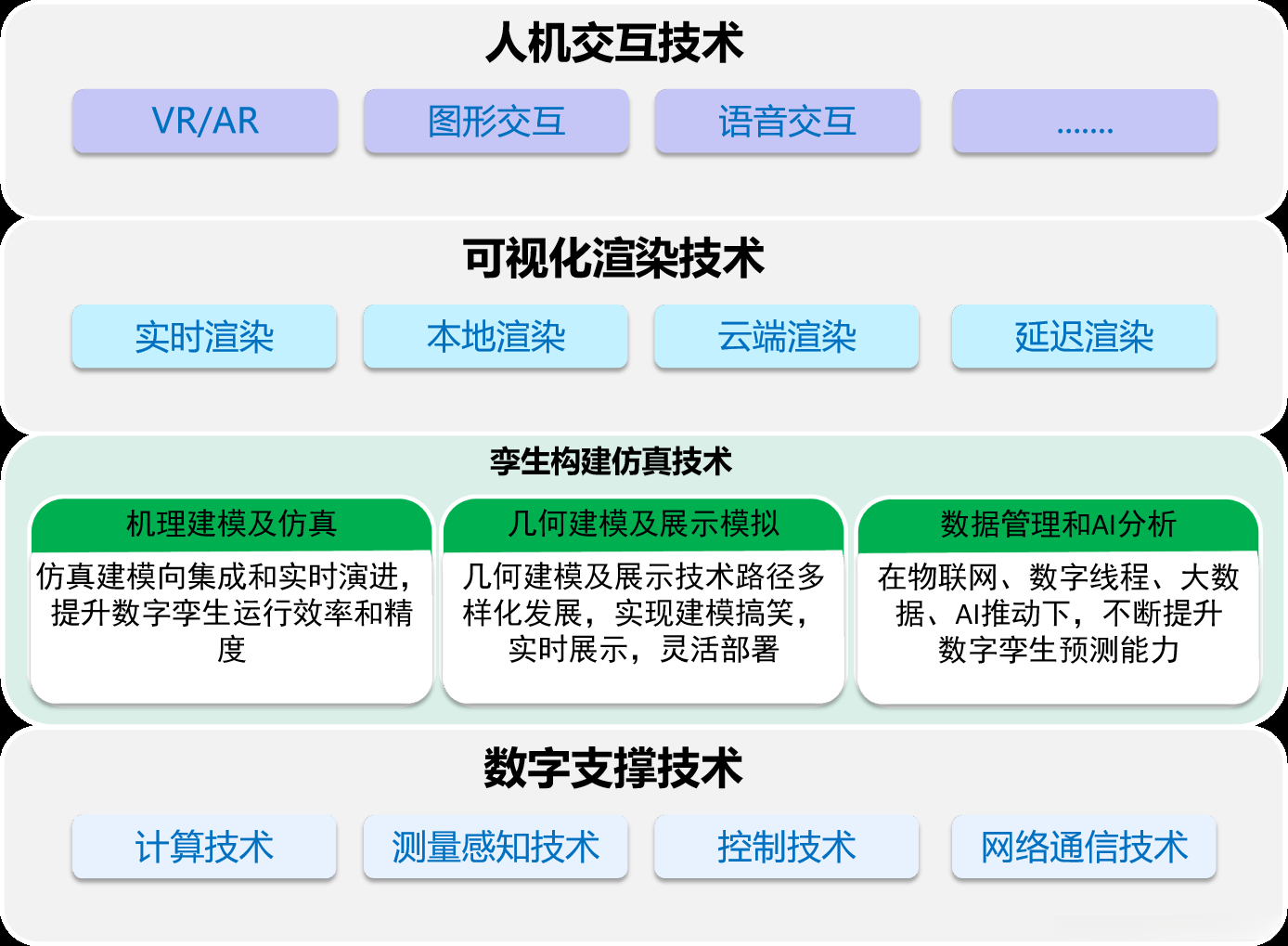主要包括数字支撑技术、孪生构建仿真技术、可视化渲染技术和人机交互技术。