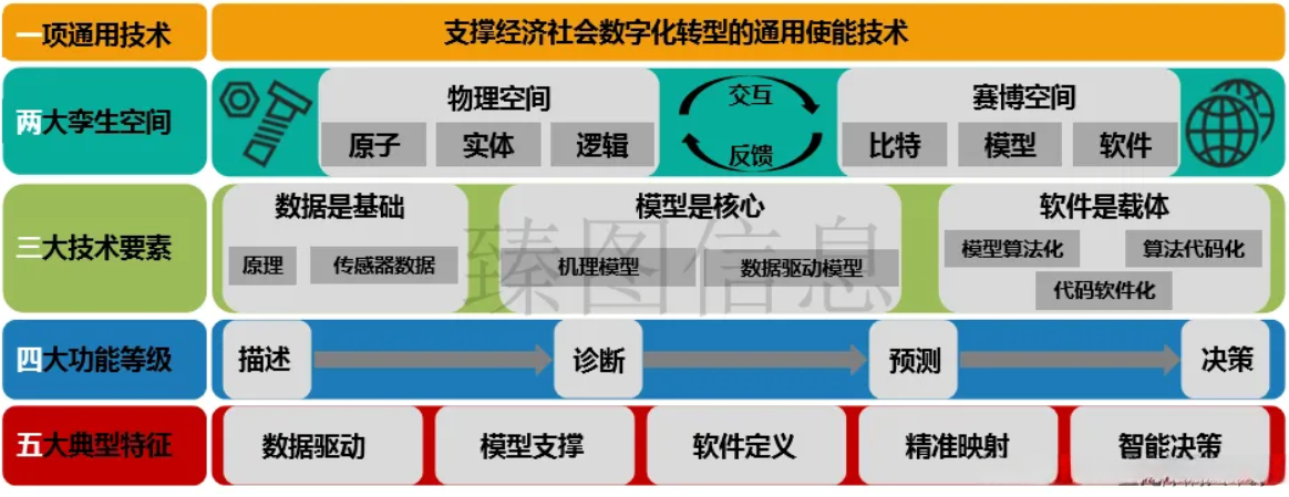 数字孪生包括一项通用技术、两大孪生空间、三大技术要素、四大功能等级和五大典型特征来表述数字孪生,是一项使能技术,综合运用了感知、计算、建模等信息技术,对物理空间进行表述、诊断、预测、决策,进而实现两个空间的映射和交互。见下图。