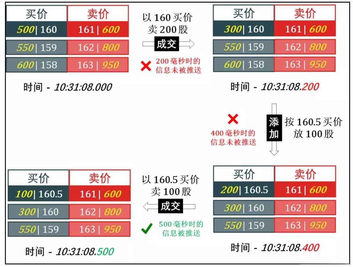 国内交易所发送的信息属于切片数据类型,并非真正的tick数据。在500毫秒的时间间隔内进行说明,在这一时间段内发生的所有变化都无法被完整捕捉到。通过下图中的立方体模型可以看出tick数据结构:每个切片单元可以视为一个快照记录(红色立方体),而深青色立方体则代表被忽略的数据部分。
