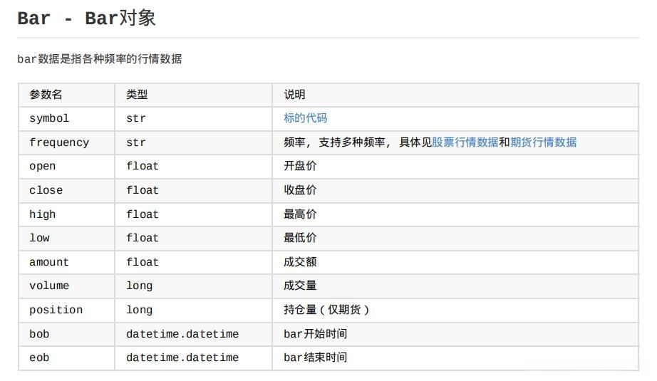 通过使用 subscribe() 接口进行标的订阅后,在后台系统会返回 tick 数据或 bar 数据两种类型的信息。每当生成一个或多个数据时(即每次数据更新),就会自动触发 on_tick() 或 on_bar() 中定义的功能模块来执行相应的操作。例如下面示例代码段中:订阅浦发银行每隔一天和每隔60秒生成 bar 数据,在每次bar数据生成时就会触发on_bar()函数,并打印获取到的bar信息: