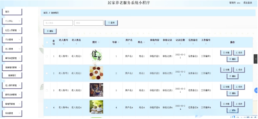 在健康管理界面中支持多个功能项进行操作,在健康状态监测页面中可以对项目编号、老人身份信息、基本信息、个人照片资料、年龄信息、用户登录名、姓名字段、医疗检查记录、医疗数据存储库以及检查时间戳等内容进行详情查看修改或删除等操作