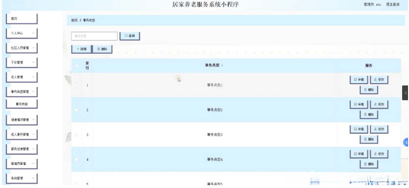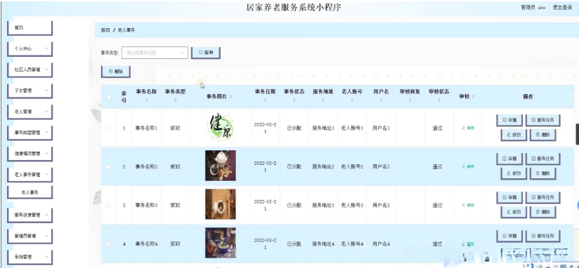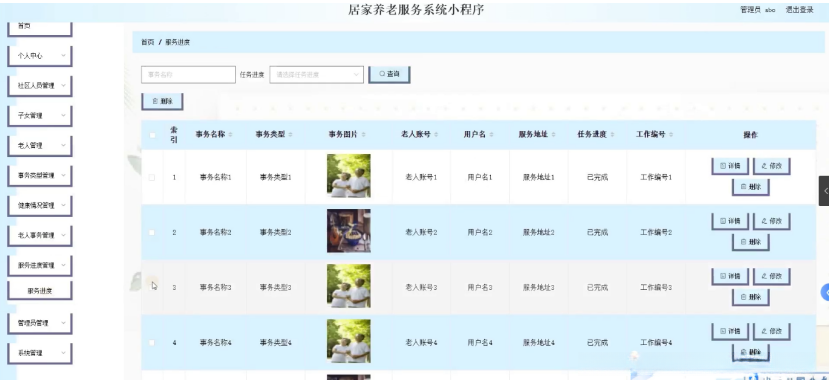 老年人事务管理系统,在老年人事务管理界面中支持处理索引、服务名称、服务类型、影像资料、办理日期以及处理进度等基础信息数据,并完成服务任务的新增修改删除操作(如图5-14所示)。