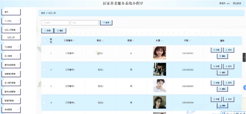 社区人员管理系统中,在社区人员管理页面上可对编号、工作编号、姓名、性别、头像和手机信息进行详细信息查看、更新设置或删除操作(如图5-9所示)。