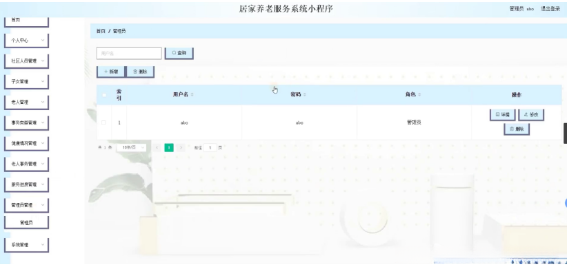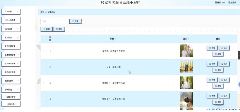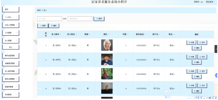 在老人管理模块中,在老人管理页面内可针对索引项、个人账号信息以及相关属性(如性别、照片、年龄等)执行详细信息查看、资料更新或资料删除等操作。