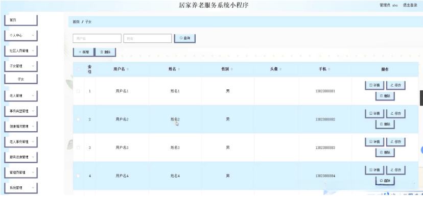管理员登录系统后即可完成对首页、个人中心、社区人员管理和子女管理等功能的操作。如图5-8所示为操作示意图。