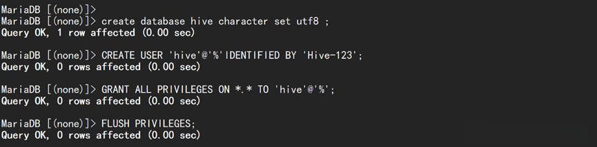 CREATE USER 'hive'@'%'IDENTIFIED BY '123456';