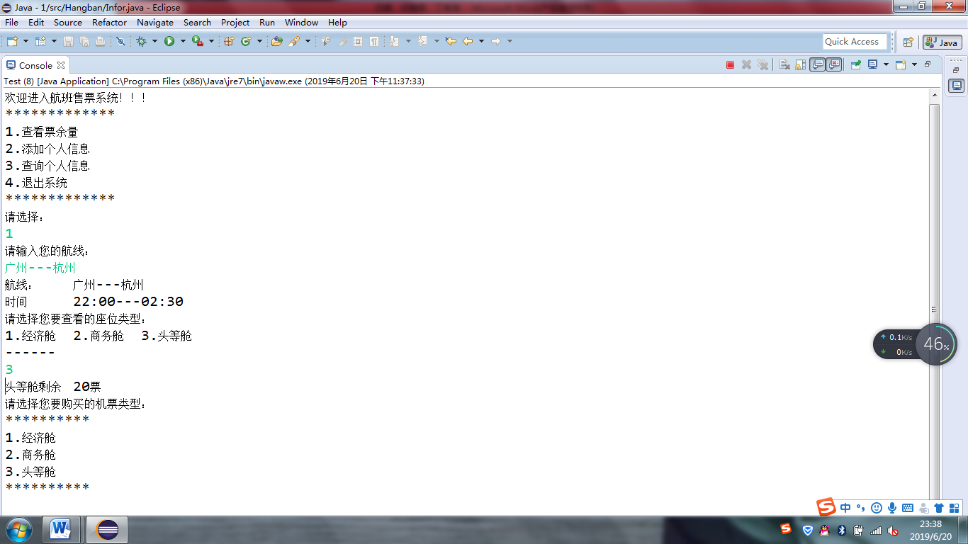 System.out.println(“头等舱暂无余票,请重新选择”);