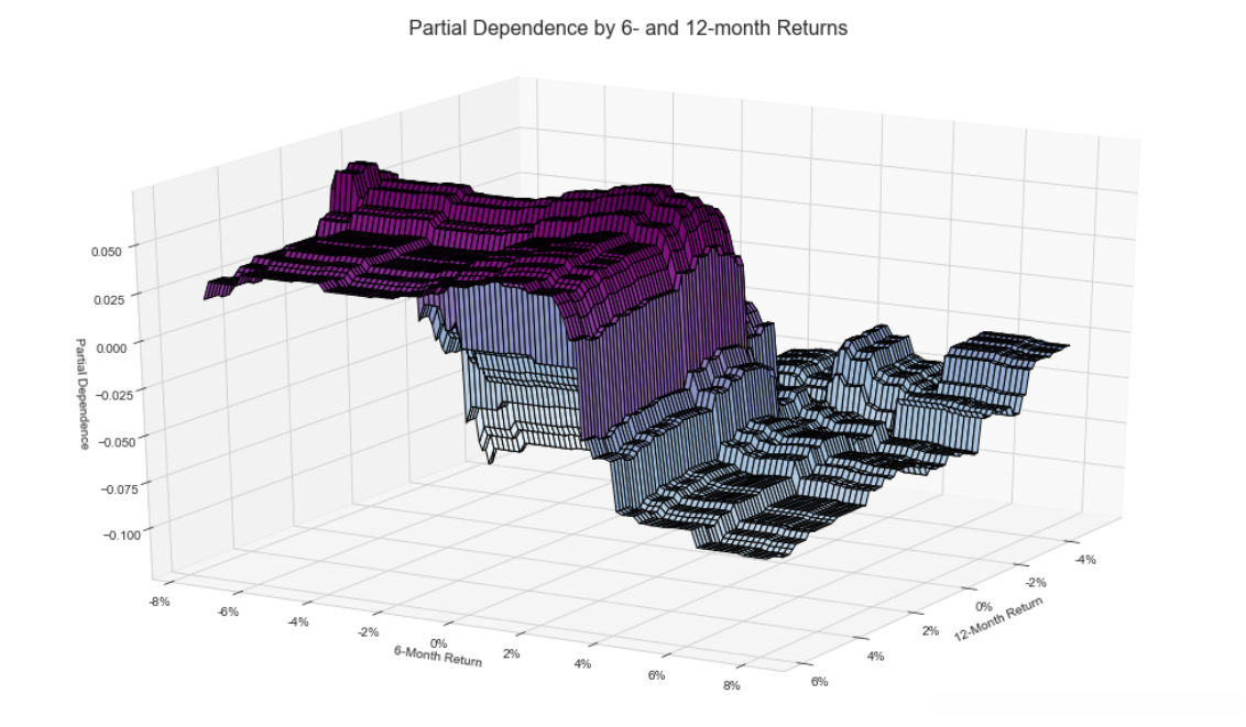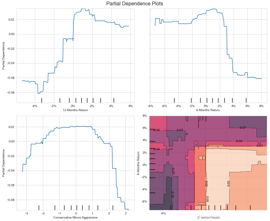 fig.suptitle('Partial Dependence by 6- and 12-month Returns', fontsize=16)