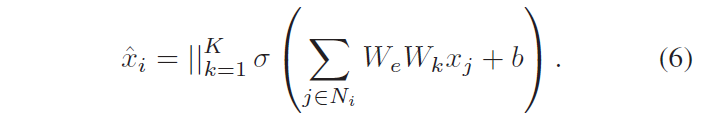其中NiN_i表示第ii个节点的邻域,WeW_e表示3.1节中描述的边缘权值,WkW_k和bb是第kk个核需要学习的参数.请注意,应用了k个内核,空间卷积的输出被定义为对kk个内核的输出的串联,从而产生反映连接节点对应关系的卷积矢量,这些节点形成了局部短语.