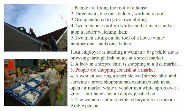 图表1:Flickr30K展示了图像与文本之间的配对关系的视觉呈现。对于每一个图像查询而言,在其结果列表中我们会展示出排名靠前的5个候选结果,并将未达到预期效果的部分标记为非绿色。