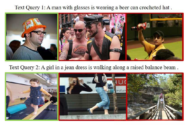 图5展示了Flickr30K中基于文本到图像匹配可视化的实验结果。当处理一个文本查询时,在图表左侧列出其最相关的三个图像中(即排名靠前的三个),未匹配的结果将被标注为红色框;而匹配的结果则被标注为绿色框。
