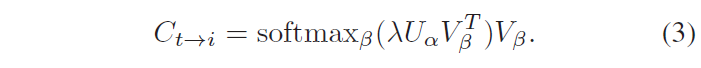 与以往方法基于学习到的一一对应关系评估全局关联性不同, 我们提出了一种多层模块 Ct→i 来评估全局关联性. 该模块通过逐层分析文本节点与其可视化的聚类中心, 计算其局部关联性. 这一过程有助于提高整体计算效率, 并将每个单值关联结果转化为向量形式以便后续操作. 具体来说, 在第 ii 个文本特征与其对应的可视化聚类中心之间划分出 t 个子区域. 多层间的关联程度则可通过逐一比较来确定其相关程度. 例如, 在每一对子区域之间评估它们之间的余弦相似度 x_{ij} = cos(u_{ij}, c_{ij}). 其中 x_{ij} 为标量值, cos(⋅) 表示余弦运算. 第 ii 个文本特征的最终关联向量可通过整合所有子区域间的关联强度来获得.