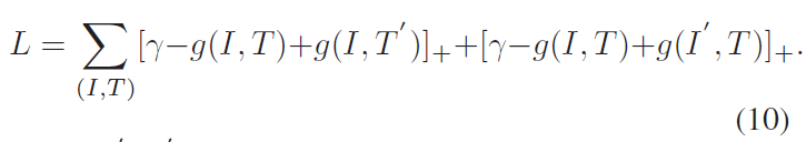具体而言,在此设定中,I′, T′代表的是硬负样本的位置。函数[\cdot]^+ [\cdot \_+]等价于\text{max}([\cdot], 0)\text{ max}([\cdot], 0)。其中,g(\cdot)和g(\cdot)分别基于公式9被定义为图像与文本对之间的全局相似度计算结果。