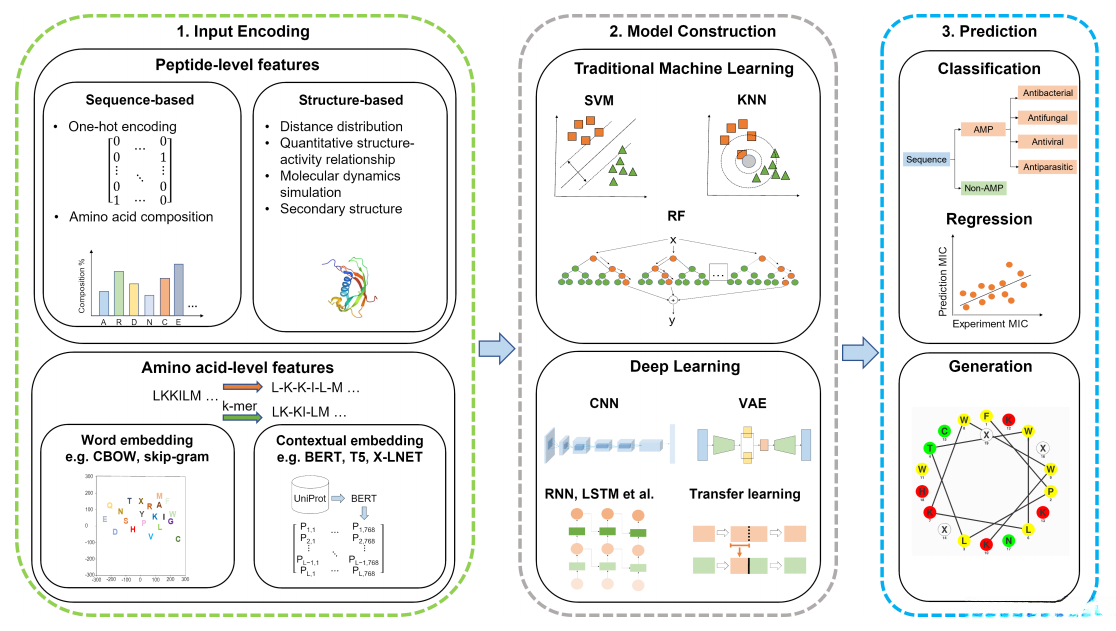深度学习方法显著提升了抗菌肽设计的准确性和效率;常见的模型是卷积神经网络(CNN)、循环神经网络(RNN)及其混合模型。