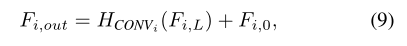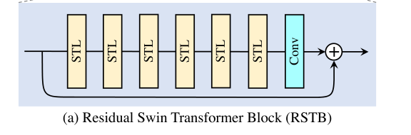 其中,H_{Swin _{i,j}}(·)是第i个RSTB中的第j个STL。然后,我们在残差连接之前添加卷积层。RSTB的输出公式如下