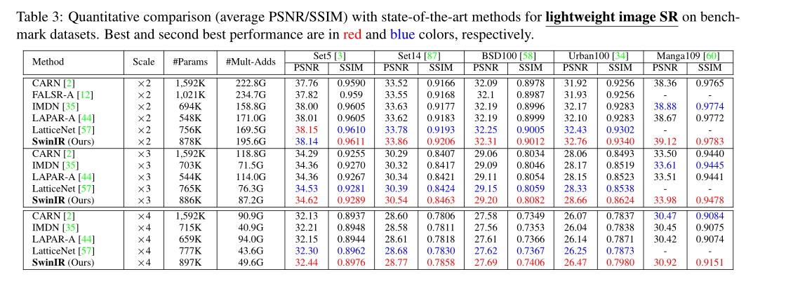 作者还将SwinIR(小尺寸)与最先进的轻型图像SR方法进行了比较:CARN[2]、FALSR-A[12]、IMDN[35]、LAPAR-A[44]和LatticeNet[57]。除了峰值信噪比和SSIM,我们还报告了参数总数和乘法累加运算(在1280×720 HQ图像上评估),以比较不同模型的模型大小和计算复杂度。如表3所示,在不同的基准数据集上,参数总数和多重累积运算相似,SwinIR在峰值信噪比(PSNR)高达0.53dB,。这表明SwinIR架构是高效的。