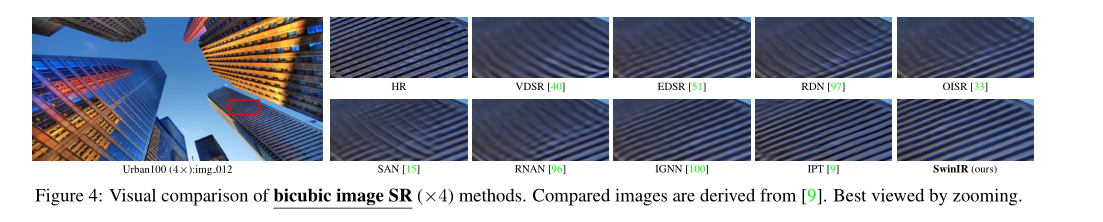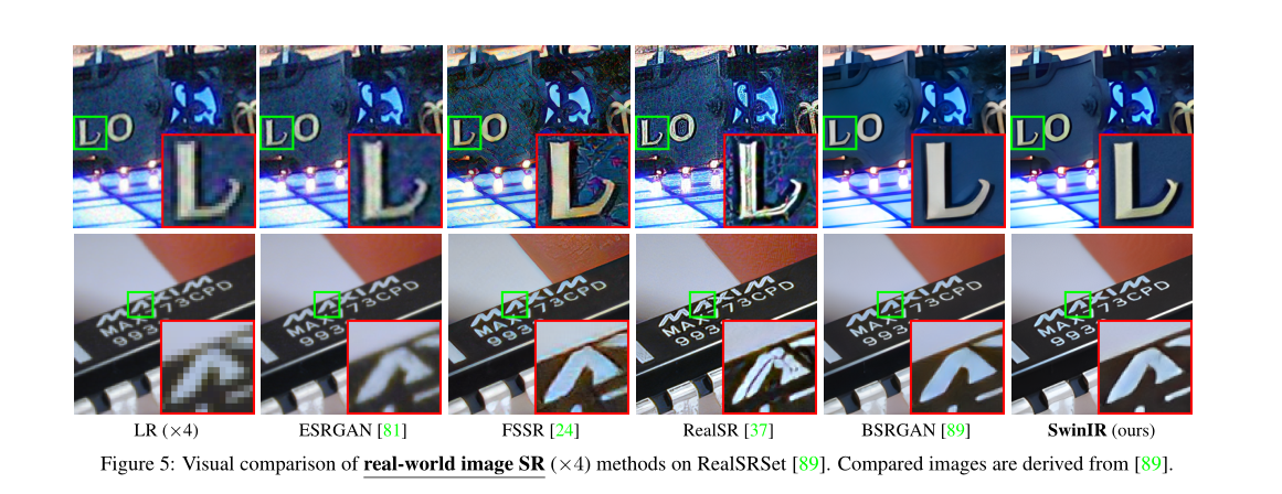 图像SR的最终目标是用于实际应用。最近,张等人[89]提出了一种实用的真实图像SR退化模型BSRGAN,并在真实场景中取得了非常好的结果。为了测试SwinIR对真实世界SR的性能,作者使用与BSRGAN相同的退化模型重新训练SwinIR,并在真实世界SR基准数据集RealSRSet上进行测试[89]。由于没有高质量的地面真实图像,我们仅提供与代表性双三次模型ESRGAN[81]和最先进的真实世界图像SR模型FSSR[24]、RealSR[37]和BSRGAN[89]的视觉比较。如图5所示,SwinIR生成了图像具有清晰锐利边缘,而其他比较方法可能存在不令人满意的伪影。