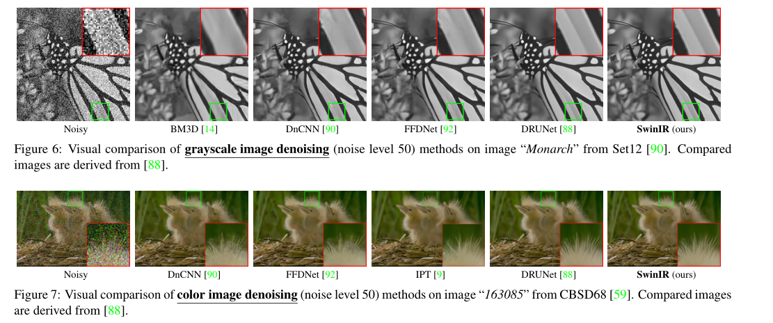 我们在表5和表6中分别显示了灰度和彩色图像去噪结果。对比方法包括传统模型BM3D[14]和WNNM[29]、基于CNN的模型有DnCNN[90]、IRCNN[91]、FFDNet[92]、N3Net[65]、NLRN[52]、FOCNet[38]、RNAN[96]、MWCNN[54]和DRUNet[88]。根据[90,88],比较的噪声水平包括15,25和50。可以看出,我们的模型比所有比较的方法都具有更好的性能。特别是,在Urban100数据集上,它比最先进的模型DRUNet高达0.3dB。值得指出的是,SwinIR只有12.0M的参数,而DRUNet有32.7M的参数。这表明SwinIR结构在学习特征表示用来图像恢复方面是高效的。正如我们所见,我们的方法可以消除严重的噪声破坏,并保留高频图像细节,从而产生更清晰的边缘和更自然的纹理。相比之下,其他方法要么过于平滑,要么过于锐利,无法恢复丰富的纹理。