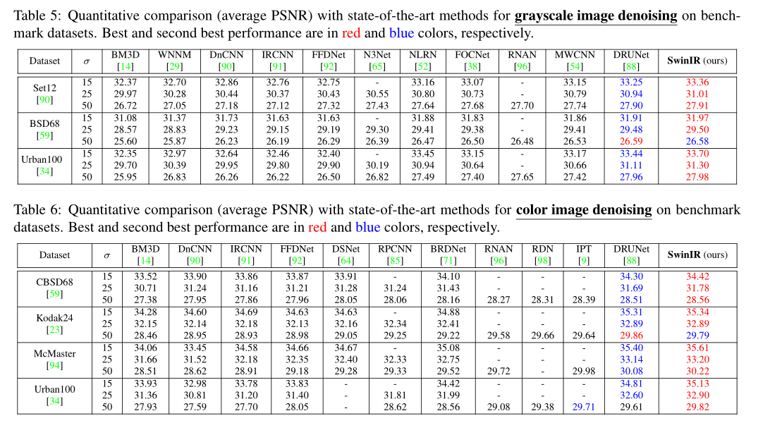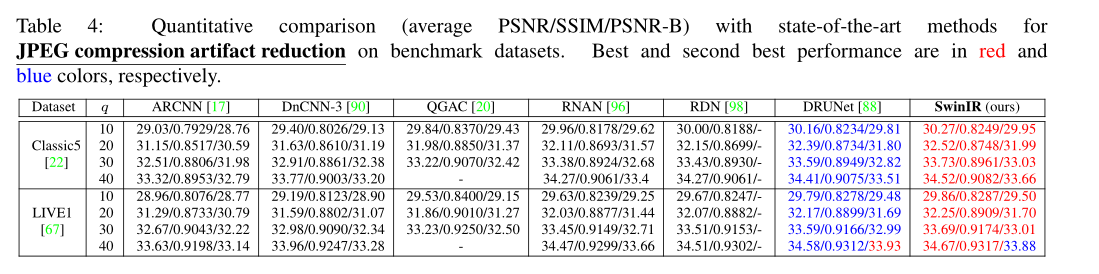 表4显示了SwinIR与最先进的JPEG压缩伪影减少方法的比较:ARCNN[17]、DnCNN-3[90]、QGAC[20]、RNAN[96]、RDN[98]和DRUNet[88]。所有比较的方法都是基于CNN的模型。作者在两个基准数据集(Classic5[22]和LIVE1[67])上测试。我们可以看到,对于不同的质量因子,在两个测试数据集上,提出的SwinIR的平均峰值信噪比增益至少为0.11dB和0.07dB。此外,与之前的最佳模型DRUNet相比,SwinIR只有11.5M的参数,而DRUNet是一个具有32.7M参数的大型模型。