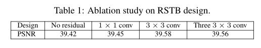 表1显示了RSTB中的四种残差连接变体:无残差连接、使用1×1卷积层、使用3×3卷积层和使用三个3×3卷积层(中间层的通道数设置为网络信道数的四分之一)。从表中,我们可以得到以下观察结果。首先,RSTB中的残差连接很重要,因为它将峰值信噪比提高了0.16dB。第二,使用1×1卷积带来的改善很小,可能是因为它不能像3×3卷积那样提取局部邻域信息。第三,虽然使用三个3×3卷积层可以减少参数数量,但性能略有下降