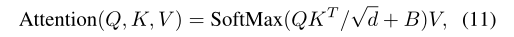 其中P_{Q},P_{K},P_{V}是在不同窗口中共享的投影矩阵。一般来说,我们有Q,K,V\in \mathbb{R}^{M^{2}\times d}。因此,注意力矩阵由局部窗口中的自注意力机制计算,如下所示