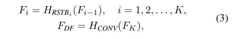 其中,H_{DF}(·)是深度特征提取模块,它包含K个残差Swin transformer(RSTB)和一个3×3卷积层。更具体地说,中间特征F1,F2,FK和最后的输出深度特征F_{DF}