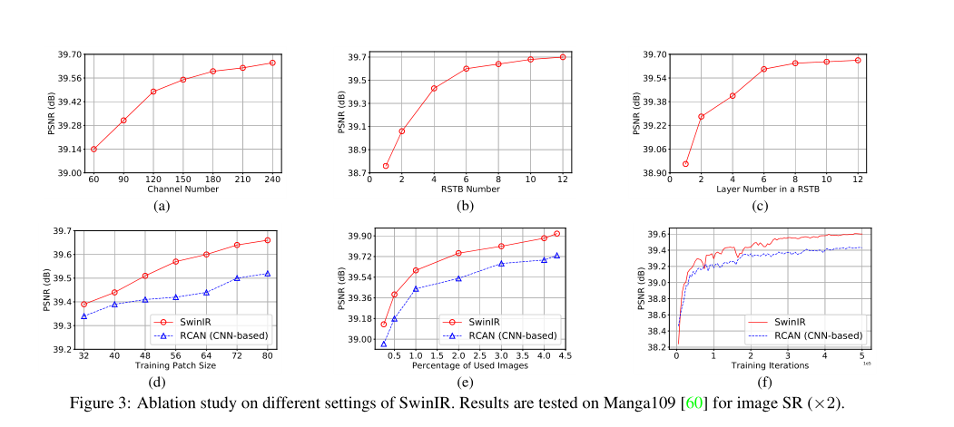 我们在图中显示了通道数、RSTB数和RSTB中的STL数对模型性能的影响。据观察,峰值信噪比与这三个超参数正相关。虽然对于较大的通道数,性能不断提高,但参数总数呈二次增长。为了平衡性能和模型大小,我们在rest实验中选择180作为通道数。对于RSTB数和层数,性能增益逐渐趋于饱和。我们为它们选择了6个,以获得一个相对较小的模型。