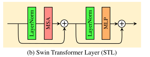 Swin Transformer层(STL)[56]基于Transformer[76]的标准多头自注意力。和原始的transformer主要区别在于局部注意力和移动窗口。如图2(b)所示,给定大小为H×W×C的输入,Swin Transformer首先通过将输入划分为非重叠的M×M局部窗口,将输入整形为\frac{HW}{M^{2}}\times{M^{2}}\times C特征,其中\frac{HW}{M^{2}}是窗口总数。然后,它分别计算每个窗口的标准自注意力 (即局部注意力)。对于局部窗口特征X\in \mathbb{R}^{M^{2}\times C},查询Q、键K和值V计算为