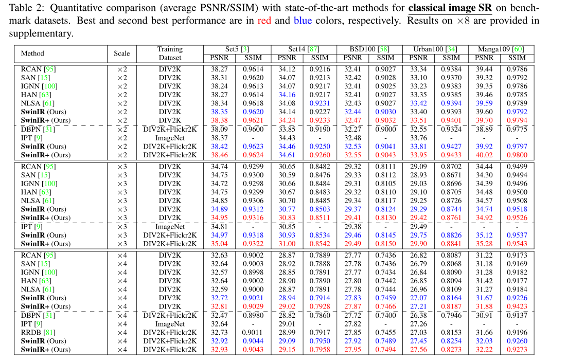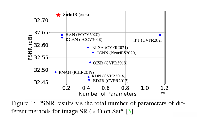 基于Transformer的SwinIR具有以下优点:(1)图像内容和注意力权重之间基于内容的交互,可以解释为空间变化卷积[13,21,75]。(2) 通过移位窗口机制可以实现长期依赖性建模(3) 参数更少,性能更好。