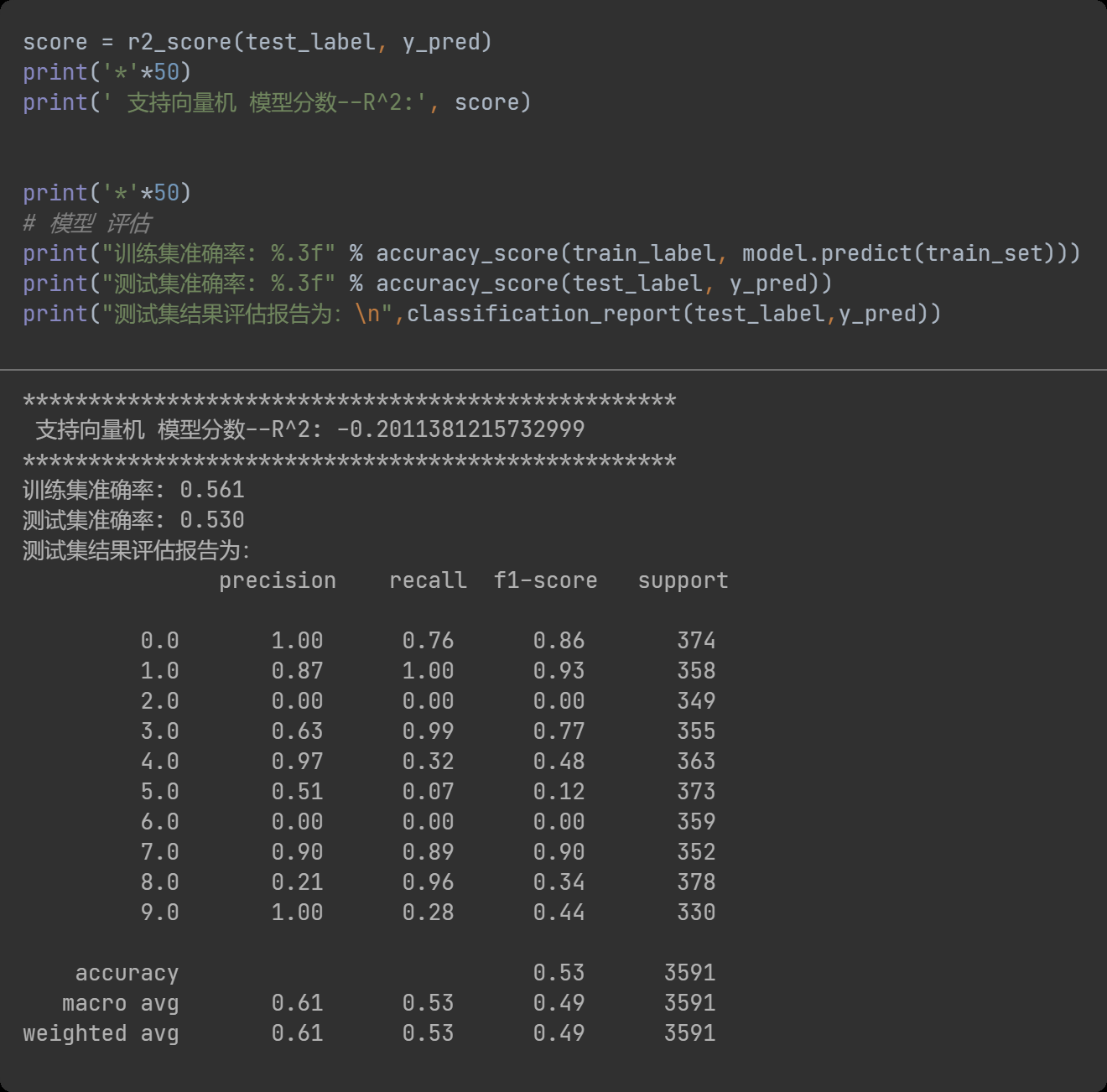 * 采用混淆矩阵、准确率、召回率等指标评估SVM分类器的性能。