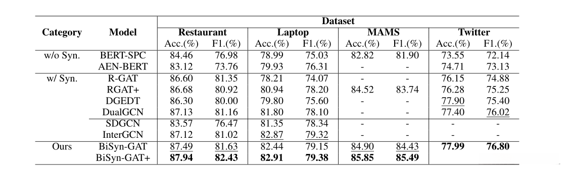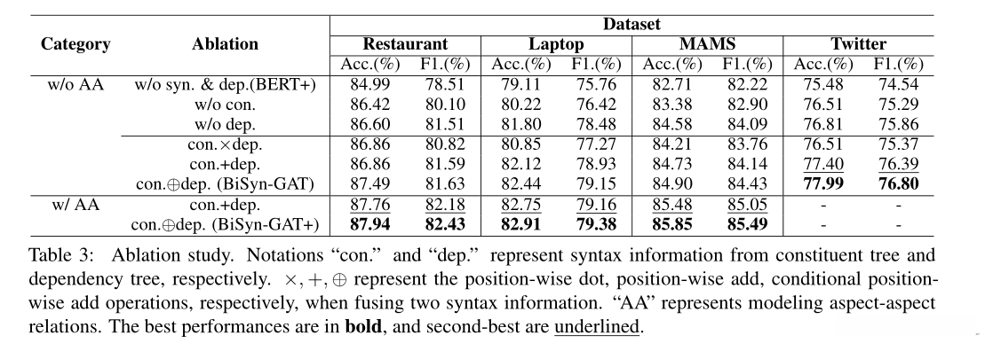 在本文中,提出了BiSyn-GA T+框架,通过充分利用构造树的语法信息来建模每个方面的情感感知上下文和跨方面的情感关系,它包括两个模块:1)intra-context module,分层次融合相关语义和语法信息;2)inter-context module,用构建的方面上下文图建模跨方面的关系。这是利用具有gnn的组成树完成ABSA任务的第一个工作。此外,提出的模型在四个基准数据集上实现了最先进的性能。