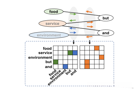 这个部分的内容时基于Phrase segmentation而进行的。在通过Phrase segmentation提取邻居方面之间的分割词术语以后,根据将相邻方面和对应的分割词术语来构建上下文,从而推断之间关系。这里作者为了区分方面上下文图之间的双向关系,构造了两个对应的领接矩阵。即奇数下标的方面对偶数下标方面的影响与偶数下标的方面对奇数下标方面的影响。