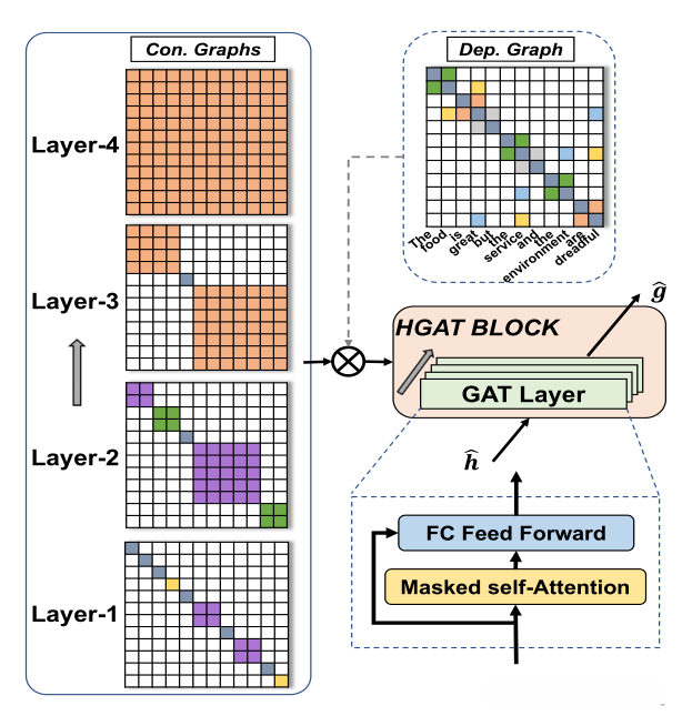 HGAT块旨在将语法信息分层编码成单词表示。从图3我们可以看到,一个HGAT块由几个GAT层组成,在这其中作者使用了一个掩码的自注意力机制来聚合邻居的信息,以及一个全连接前馈层来讲表示映射到同样的语义空间,具体公式如下。