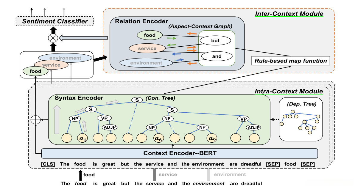 从整个模型上我们可以看到,它将句子和方面词作为输入从而输出所有方面的情感预测。整个模型主要由三个部分组成:1)上下文内模块(intra-context module)包括了两个编码器:一个输出上下文单词表示的上下文编码器,一个利用解析过的结构树(或者依赖树)的句法编码器。从这两个编码器输出的表示会被融合来产生特殊的方面表示。2)上下文间模块(inter-context module)包括一个关系编码器,这个关系编码器被用来构造方面上下文图来获得关系增强表示。方面上下文图包括了所有的方面以及从应用于结构树的一个基于规则的映射函数获得的短语分词术语。3)情感分类器采用两个模块的输出来进行预测。