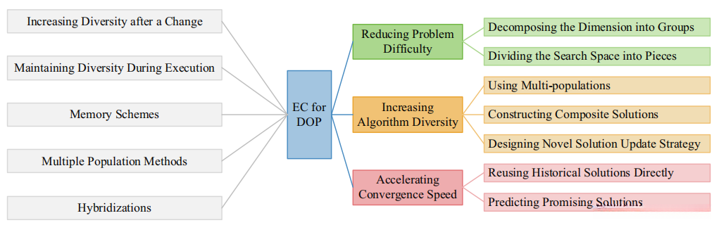 增加算法多样性 :在使用EC算法求解DOP时,种群在进化过程中会逐渐收敛,所以当环境发生变化时需要跳出之前的局部区域。保持多样性有利于避免算法陷入局部区域,不断探索搜索空间并找到新的最优解。因此人们提出了许多提高算法多样性的方法: