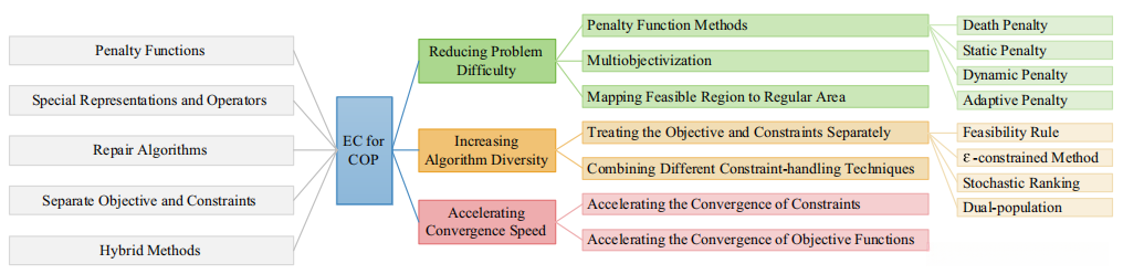 约束优化问题是一类需要满足一组约束条件的复杂问题。因此在搜索空间中存在大量的不可行解,因为它们可能不满足一个、一些或所有的约束条件,只有一小部分的搜索空间包含可行解。由于EC算法具有强大的搜索能力,近几十年来许多研究人员都将其用于求解COP问题。然而很难确定哪个解更好,因为位于COP不可行区域中的解也可能有很好的适应度值。因此在使用EC处理COP问题时,我们需要结合约束处理技术(Constraint Handling Techniques, CHTs)。其中EC算法作为搜索引擎,同时CHTs指导算法如何为下一代的种群选择解。解决COP问题的经典技术分类如图8 的左侧所示。根据面向功能的分类方法对使用EC算法求解COP问题的方法进行分类,如图8 的右侧所示。