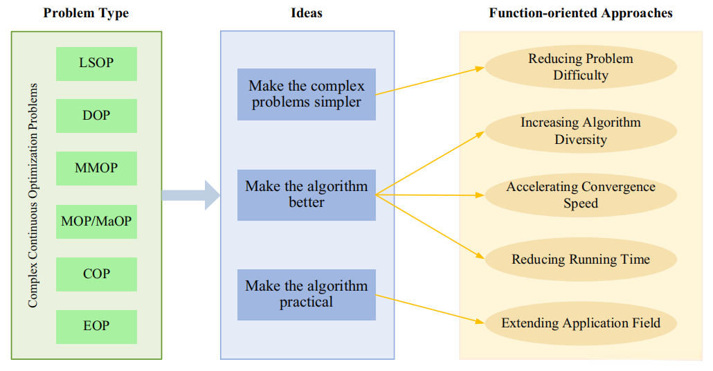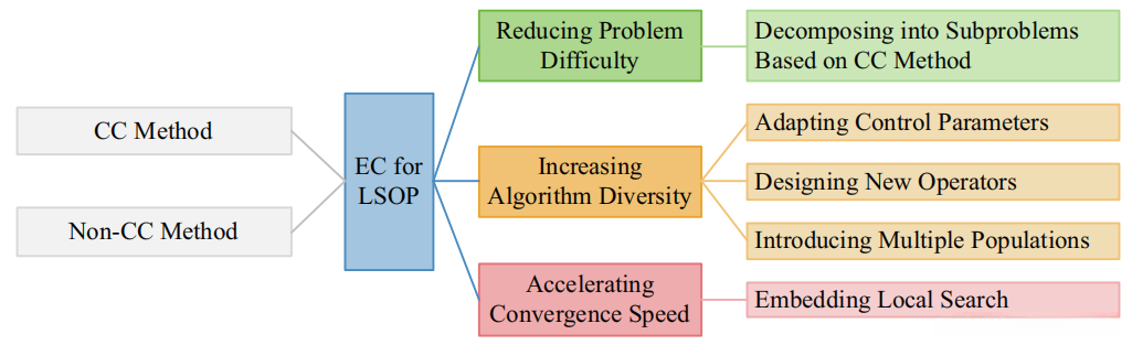 - 增加算法多样性 :由于LSOP问题的高维特征导致搜索多样性不足,一些算法可能陷入局部最优。因此,我们可以通过增加算法的多样性来提高算法求解LSOP的性能。这些方法主要可以分为三类:1)自适应控制参数:EC算法中一些可能影响算法多样性的参数可以自适应控制;2)设计新的算子:例如许多研究人员修改了标准粒子群算法的速度和位置更新方法,以增加算法的多样性;3)引入多个种群。