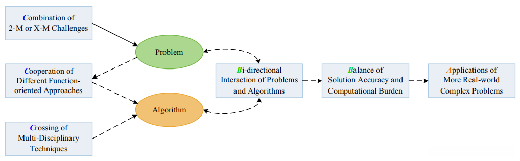 在未来,问题会变得越来越复杂,算法也会变得越来越强大。事实上,EC算法本身也是一个复杂的系统。因此,如何有效地优化这个复杂系统(即EC算法)来有效地解决其他问题(如已解决的复杂优化问题)似乎是一个有趣的问题。针对复杂连续优化问题中已定义的5-M挑战,我们是否可以认为EC算法中也存在部分或全部此类挑战(或命名特征)?例如,如果我们设计一个具有非常大的种群规模的EC算法,则该算法是一个大规模的系统吗?在这种情况下,我们是否可以使用处理大规模挑战的方法来提高大规模种群规模的EC算法的性能?如果我们在进化过程中动态地改变EC算法的参数或算子,该算法是否是一个动态系统?在这种情况下,处理DOP的动态优化技术可能有助于增强动态EC算法。因此,问题与算法的复杂性和挑战性可能有一定的关系和相互作用。复杂的问题如何与复杂的算法相互作用,反之亦然?这种问题和算法的双向交互必将成为一个有趣的未来研究课题。