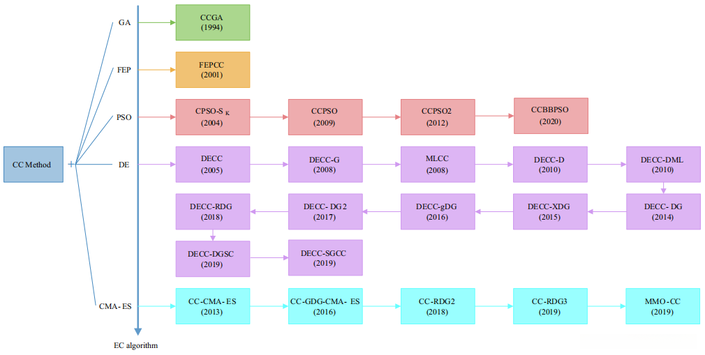 - 降低问题难度 :利用分治思想(“divide-and-conquer”)的CC方法是一种著名的、常用的降低LSOP问题难度的方法。换句话说,CC方法的目标是将整个LSOP问题分解成几个决策变量较少且更容易解决的子问题。基于CC方法的EC算法发展路线图如图4 所示,它表明利用CC方法降低问题难度以有效求解LSOP问题的研究是长期发展的,目前仍十分活跃。图4 中基于CC的算法对子问题一视同仁,也就是说所有的子问题都由相同数量的计算资源进行优化。但由于不同子问题中变量的数量不同,子问题之间存在不平衡。因此也有很多关于不同子问题应该分配不同计算资源的研究。