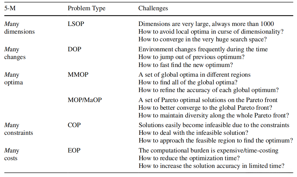 由于5-M挑战的存在,复杂连续优化问题比传统连续优化问题更加困难。具体来说,LSOP、DOP、MMOP、MOP/MaOP、COP和EOP所面临的挑战见表1 。